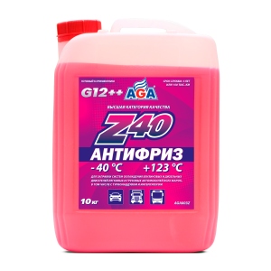 Антифриз AGA-Z40/G12++ (AGA003Z/10 кг). Назначение: Универсальный антифриз. Предназначен для систем охлаждения бензиновых и дизельных двигателей легковых и грузовых автомобилей всех марок, а также автобусов. Идеален для высокофорсированных двигателей, работающих в тяжелых условиях с высокими силовыми нагрузками (движение по пересеченной или горной местности, буксировка прицепа и т. п.). Спецификации: Разработаны в соответствии с требованиями: ASTM D 3306/4985/6210; Chrysler MS-12106; BMW N600 69.0; VW, Audi, Porsche, Seat, Skoda: VW TL 774-G (G12++); Mercedes-Benz 325.3/325.5/325.6; Ford WSS-M97B44-D/E; Hyundai/Kia MS 591-08; Renault 41-01-001/—T; MAN 324 Type Si-OAT; CUMMINS CES 14603. Совместимость: Допускается смешивать в любом соотношении с антифризами класса «–40°С» других марок, соответствующими спецификациям: G-11, G-12, G-12+, G-12++, G-13. Срок службы: до 5 лет, или 150 000 км пробега. Рабочий температурный диапазон: от –40 до +132 °C. Воспламеняемость: Не горит, в составе нет метанола и глицерина.